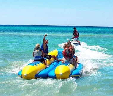 Hold on tight as you ride the waves on our thrilling banana attraction. Hop aboard with friends and enjoy the laughter and excitement as you zip through the water. Experience the ultimate beach adventure. Book now for a wild ride!